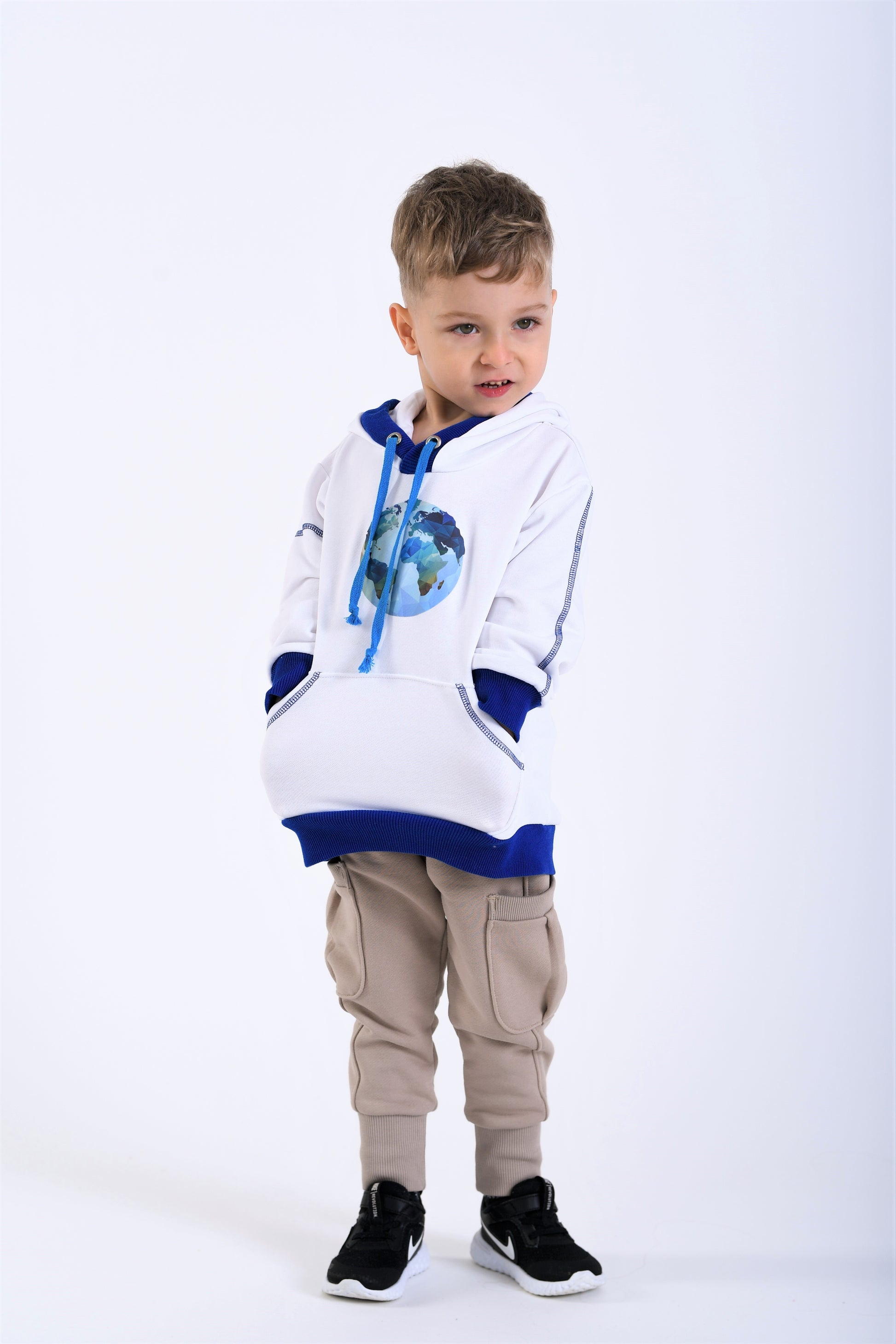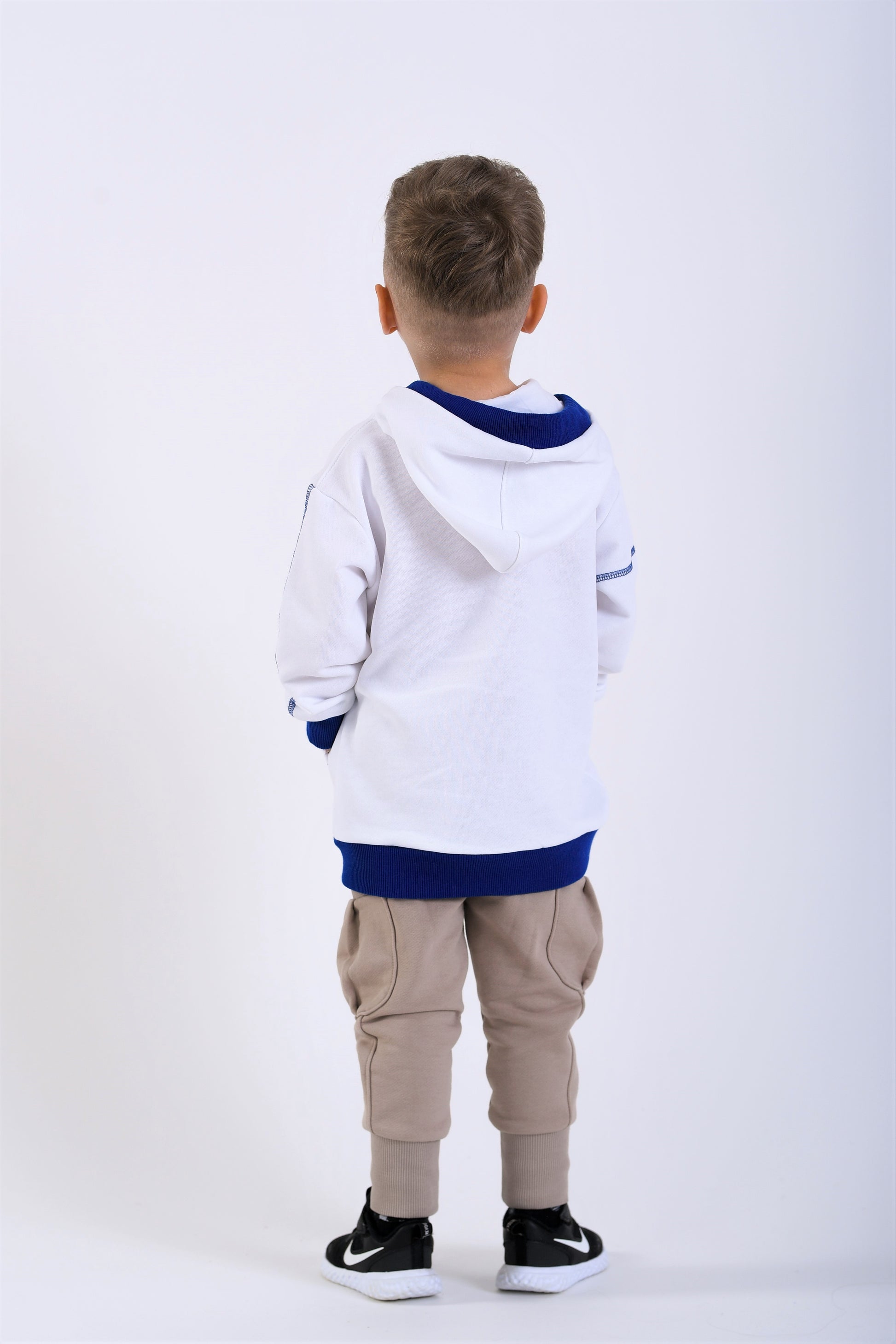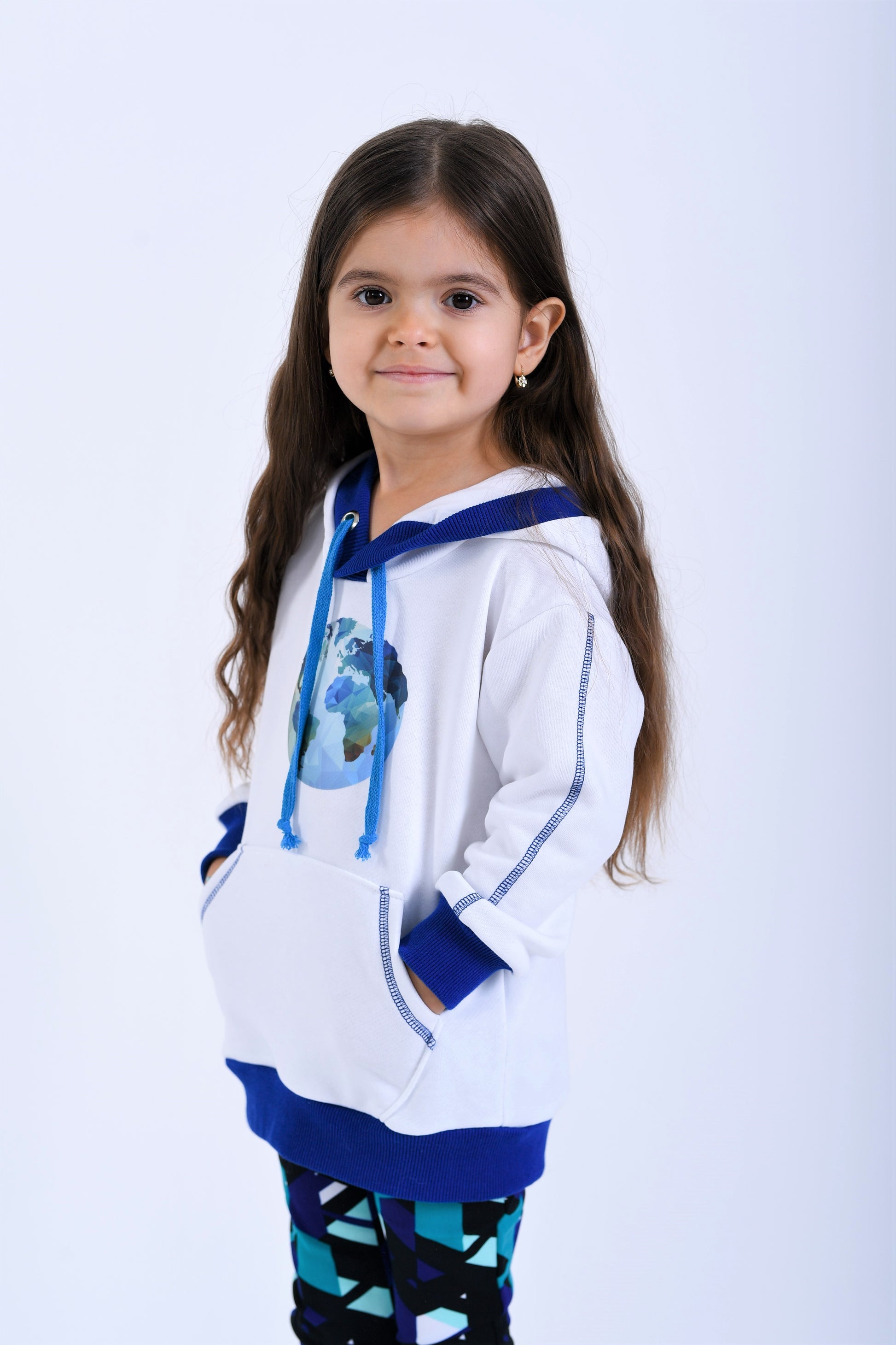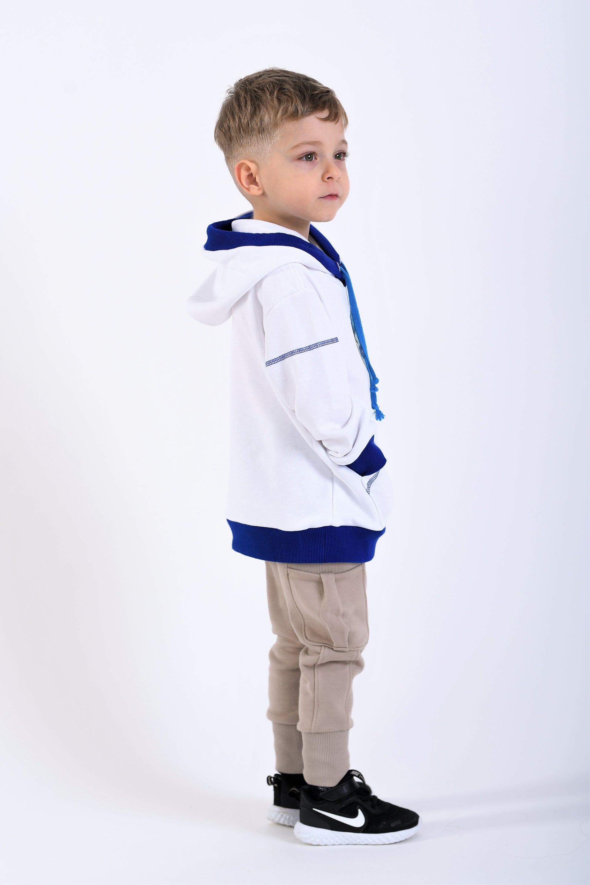 Hanorac cu gluga captusita , tesatura patent si cusaturi contrastante albastru cobalt intens, cu buzunar marsupiu, patent la gluga si snur.