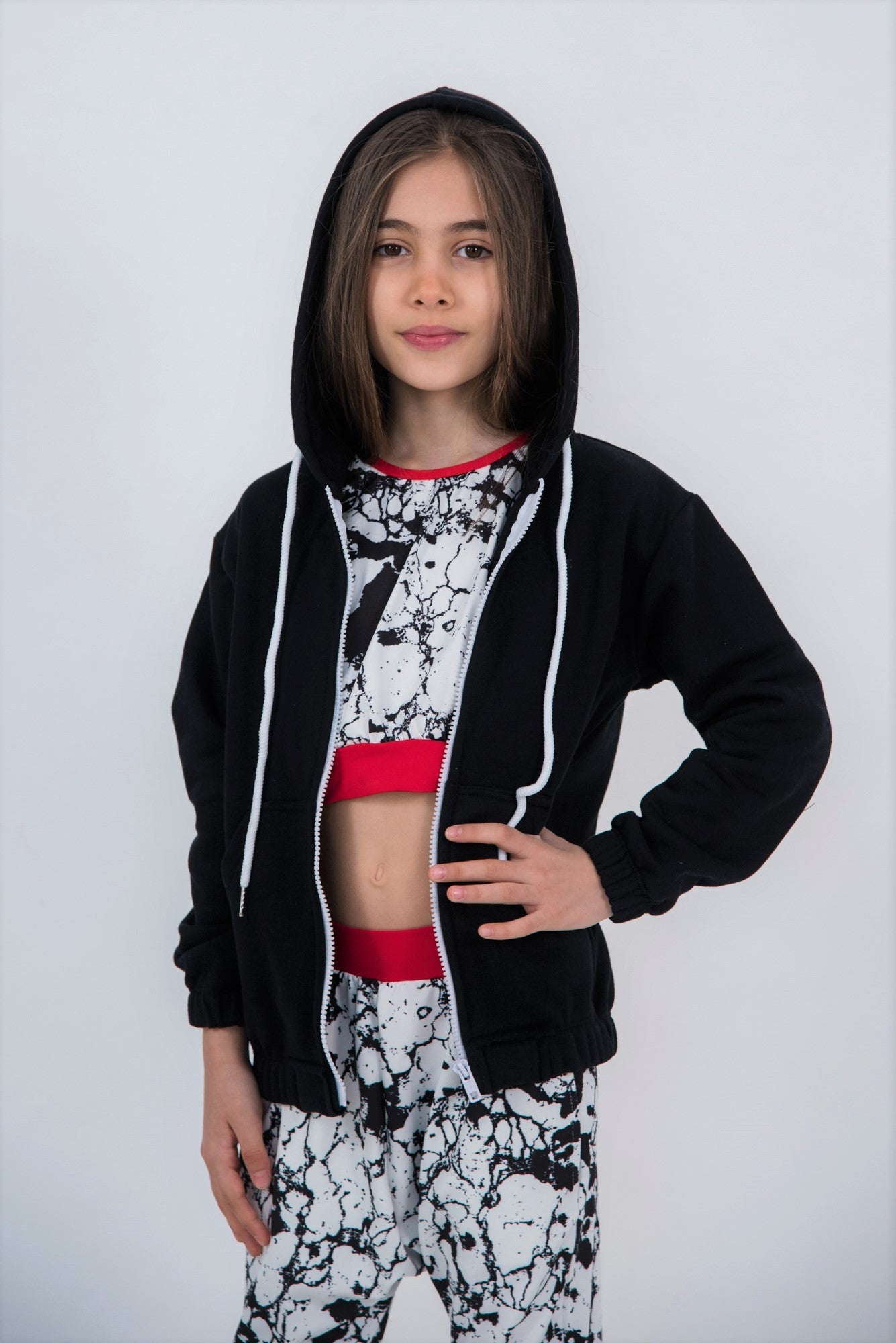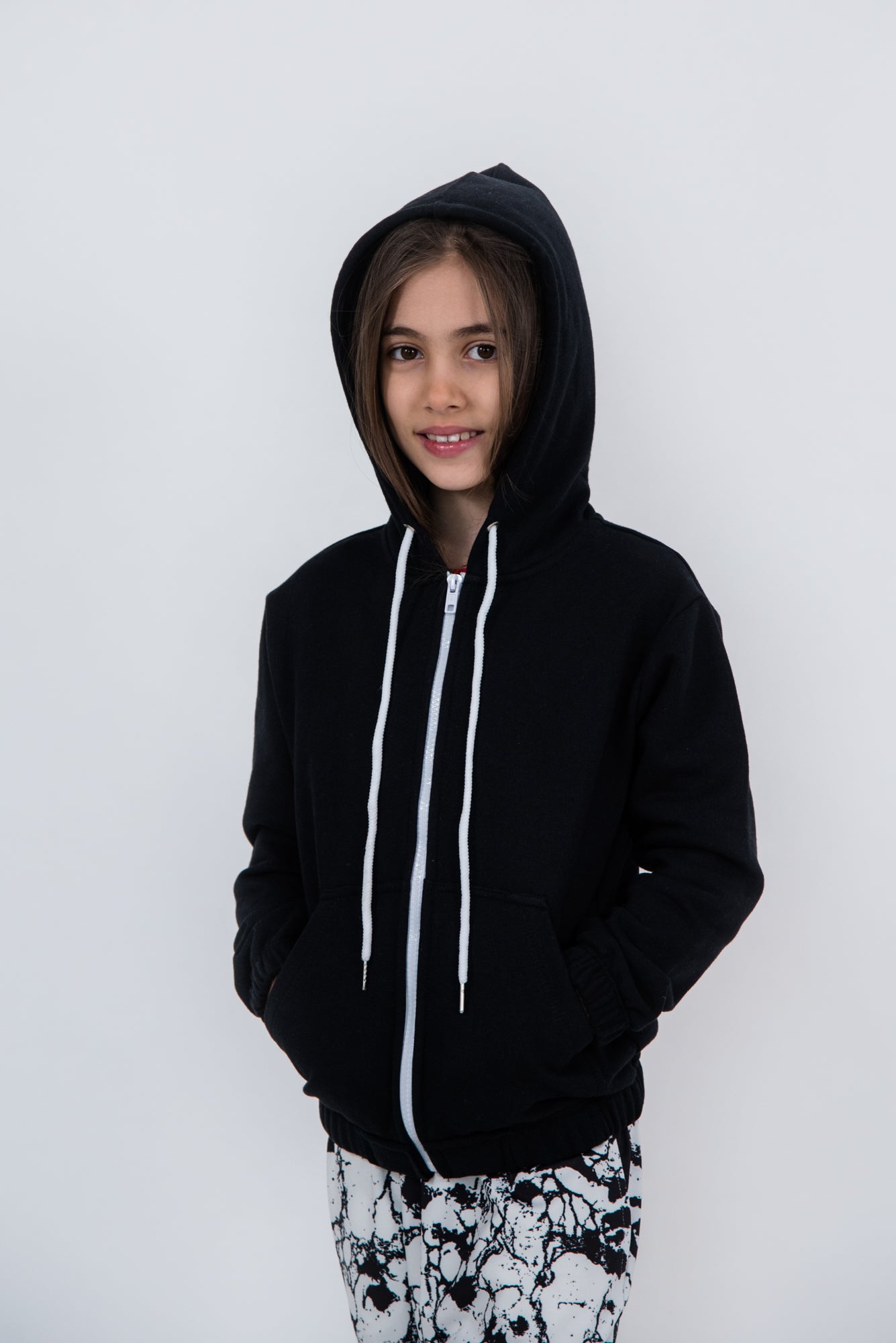 - Hanorac cu gluga si buzunar tip marsupiu, fermoar in culoare contrastanta, elastic la terminatie si mansete, snur din bumbac