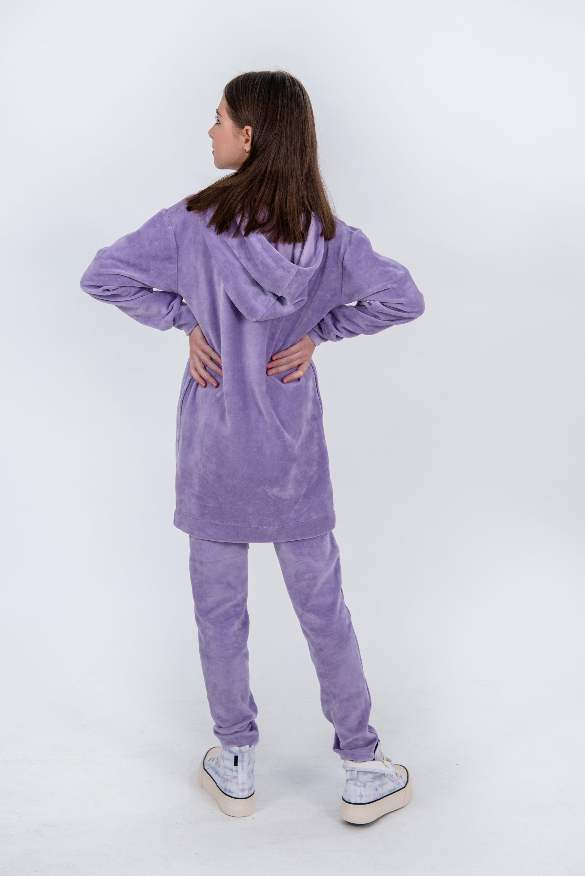 Costum de catifea alcatuit din 3 piese; hanorac lung cu gluga, buzunare si fermoar, tricou cropped din bumbac subtire cu mansete de rib decorat cu banda de catifea si pantaloni slim cu snur in talie
