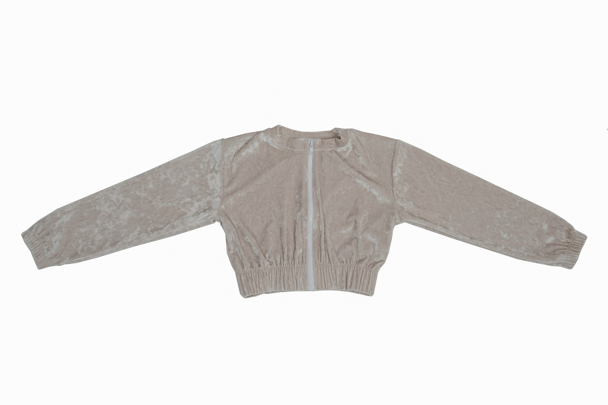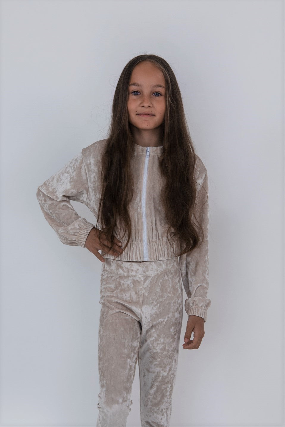 Set de catifea alcatuit din jacheta cropped cu fermoar si elastic in talie si la mansete si pantaloni slim, tip colant cu elastic in talie