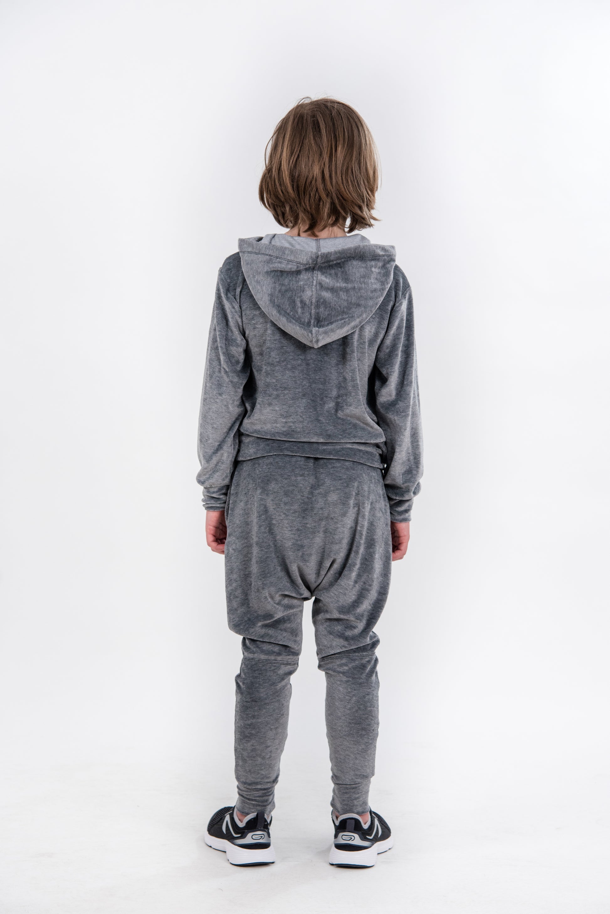 Trening din catifea moale format din hanorac cu gluga si buzunar tip marsupiu rotunjit si pantaloni cu turul lasat cu buzunare laterale si elastic in talie cu snur