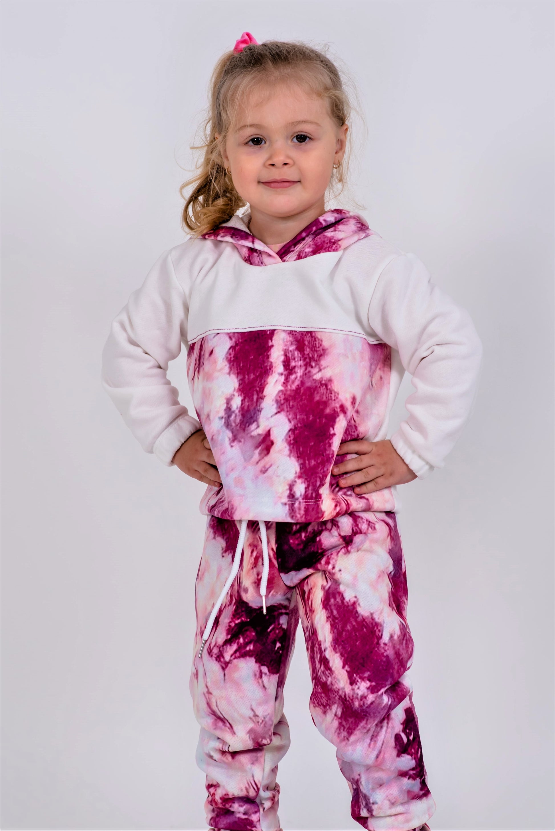 Set alcatuit din hanorac din doua culori cu gluga, elastic la mansete si snur la talie, model usor cropped si pantaloni largi cu elastic in talie si la mansete